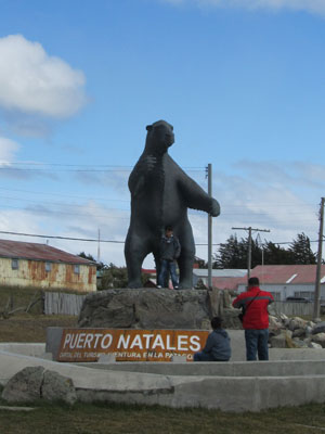 16kmほど走って見えてきたプエルト・ナタレスの町。汐のかほりがする素敵な町でした。もっと大きな町なのかと思いきや、意外と小さめ。そして、もっと観光地化しているのかと思いきや、カラファテと比べると、全然普通っぽい町。で、町の入り口に、おかしな像を発見。思わず写真に撮ってしまったのだが・・・これが、古代生物ミロドンらしい。うぬぬ、ミロドン洞窟へ行って、ミロドンの再現像を見るのを楽しみにしていたのだが、ここで見れちゃうとは・・・洞窟までいく意味がないぢゃないか・・・
