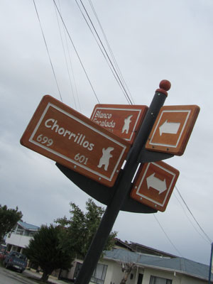 そんな感じで今日はほぼ宿に居たのですが、一日宿にこもっているのもなんなので、お昼に、プエルト・ナタレスの町を散歩。この町、通りの名前を書いた標識一つ一つに、ミロドンのアイコンが描かれている。コレを見るたびに心が和む。ゆるキャラですな、ミロドンって。