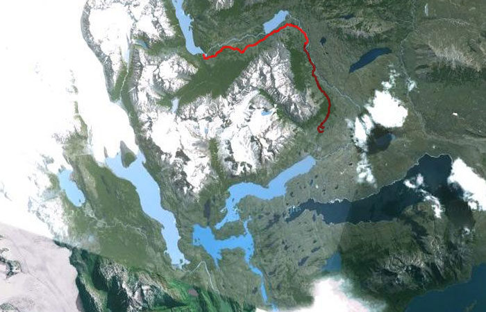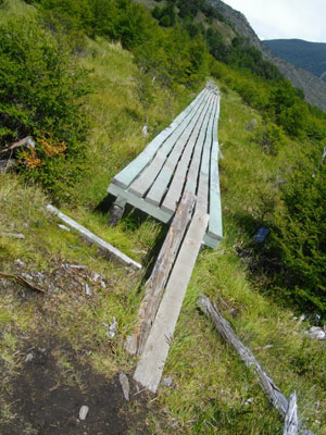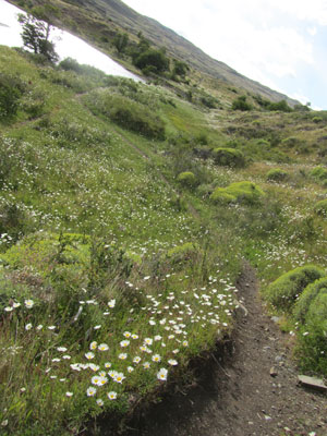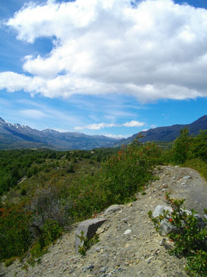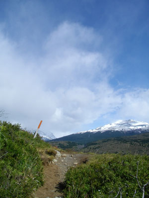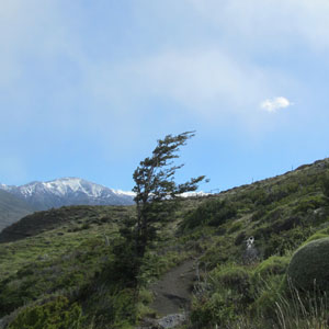 歩きはじめると、すぐに雨はやんできて、しかも、晴れてきた。う~ん、ホント天気がコロコロ変わるな。とにかく、青空と太陽光が見えると、トレッキングのテンションは倍くらい上がる。ちょっとだけ急な上り道を上り、一つ目の峠を越す・・・と、前から猛烈な風が吹き荒れてきた。いや、マジ、ハンパない。前傾姿勢で進まないと、このまま体ごと持っていかれてしまいそうなほどの強烈爆風。実は、昨日、マップを見ていたら、ちょうど、今日のコースの一つ目の峠のあたりに風を吹く風小僧のようなアイコンマークが描かれていたんです。これはひょっとしてと思っていたのですが、いや、そのひょっとしてでした。あのアイコンは爆風マーク。強い風が吹き荒れるというパイネの中でも特に暴風が吹く可能性のある場所に、風小僧マークが描かれていたわけなんです。いや、ルート40で、最上級の風を体験しちゃっているオイラなので、この猛烈な風も、まぁ、なるほど、と大した驚きもなく、受け入れられるんですが、初めてパイネでこの風を体験したら、そりゃ、ビックリするだろうなぁ。いやぁ、日本では、ありえないですから、こんな暴風。