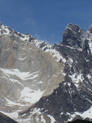 ディクソンキャンプ場は、ちょうどトーレスの裏側に位置する。といっても、トーレスとの間には、いくつかの大きな峰がそびえ立っており、トーレスの姿を拝むことはできないんだけど。でも、その峰が美しく雄大なので、景色的には大満足。そして、峰と反対側にはディクソン湖が横たわっている。奥に見える氷河から流れてきたのか、でっかい氷片がキャンプ地近くにプカプカと浮いている。