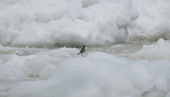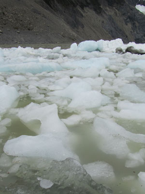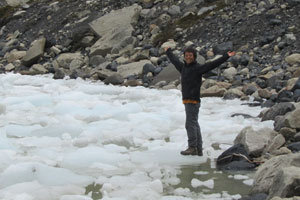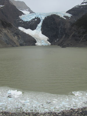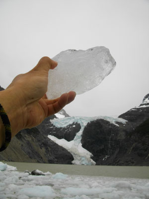 さて、しばらく歩くと、氷河が見えてきた。ペロス氷河だ。この手の山岳氷河は、たくさん見てきちゃったので、個人的には、もう、そんなに大きな感激はないのですが・・・素敵な氷河ですよココも。氷河手前の湖に、氷河の氷片がいっぱい浮かんでいる。しかも、手前の岸にいっぱい流れ着いているので、せっかくだからと、リョウマくんと二人で、手前の岸まで行ってみることに。氷片は、小さいものが多いのだが、中には、人が乗れそうなデカイものも。モノは試しと、恐る恐る乗ろうと試みたのだが、ビックリするくらいツルツル滑る。一瞬乗れたか、と思った瞬間、片足が湖にポチャン・・・慌てて足を引き上げる。さすがウォータープルーフ靴、一瞬の水没ならば、水は中まで浸透してこない。まぁ、無謀な挑戦は止めておこうと思って、リョウマくんの方を見たら、なんと、楽々と氷河に乗っちゃっているじゃないですか。あらら・・・若いってすばらしい。
