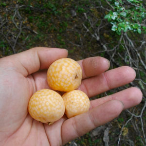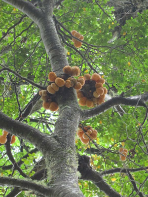 そんなこんなで、いつもとはちょっと違った感じで、歩いていると、足元に銀杏のようなモノが転がっているのを発見。なんだろう?と思って拾い上げると、「あ、それキッタリアですよ、食べられるそうですよ、それ」と、リョウマくん。木に寄生するという黄色いキノコ、キッタリア、落ちたやつはしなびちゃって固いのだが、まだ木になっているやつは、プニプニしていて柔らかい。本当は、国立公園内の動植物を勝手に取ってはいけないのだが、食べられると聞いたからには、食べてみないと気がすまないオイラは、3つほど、プニプニのキッタリアをいただくことに。今晩はこれで、キノコパスタに挑戦です。