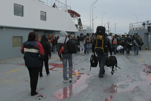 ストも終わったし、ビデオ編集もとりあえず3編アップできたし、いよいよ今日、フエゴ島に出発することに。おととい、船が9時に出ることを確認しておいたので、7時に起きて、飯を食べて出発。フェリー乗り場に到着したのだが、チケット売り場がまだ開いていない。ん~、ちょっと早く来すぎたか、と売り場の前で待つことに。しばらく待っていたら、夫婦旅行者のおじさん、おばさんが、港に停めてあるフェリーの方からやってきた。