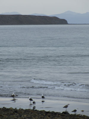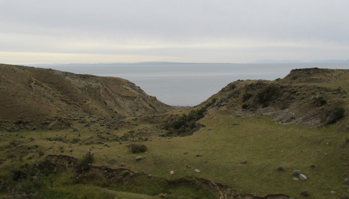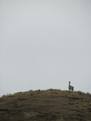 ポルベニールの村を出ると、道は未舗装になり、いつものパタゴニアの風景が広がり始めた。海岸には、海鳥が戯れ、道脇には、グアナコがたたずんでいる。相変わらず、素敵な風景だ。曇っているのが残念。