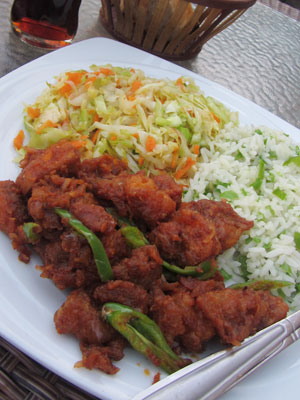 で、もうひとつの要因としては、ここ、ゴンダールの<ハベシャカフェ(Habesha cafe)>という喫茶店式レストランの<フィッシュゴーラッシュ>というメニューにドはまりしてしまいまして。シミエンに行く前に、たまたま入った、ハベシャカフェ。何を食べようかと迷った時に、ふと目にした<フィッシュゴーラッシュ>。そういえば、ユースケくんが、「このフィッシュゴーラッシュ、どこに行っても外れがないメニューなんですよ」と言っていたのを思い出し、食べてみることに。で、これが美味かった。魚のフライじゃなくて、魚にエビチリのチリソースをもっと粉っぽくしたような衣をまぶしてあるっていう料理。このソースの部分の味付けが絶妙で。ということで、シミエンから戻ってきて、ずっと夕飯はこれっていうくらいのハマリっぷり。この、フィッシュゴーラッシュが、ゴンダールにもう一日居ようって思うことになった一因。
