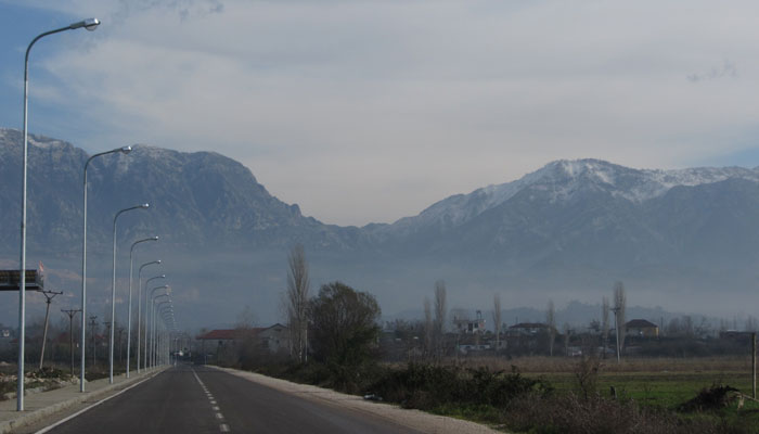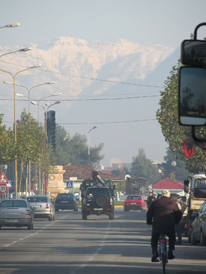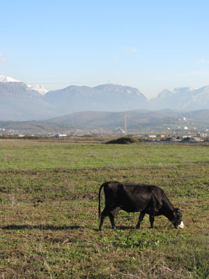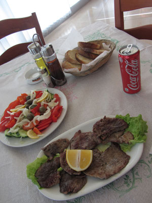 そんなワケで、寒いから、疲れたからといって、その辺で立ち止まって休むワケにもいかない。走っていて体を動かしていれば、まだ体が温かくなって耐えられるのだが、停まった途端に、寒さが体をいじめてくるのだ。疲れたけど、休めない・・・体力不足の体には、しんどすぎる・・・と、走りにへばりきったところで、昼食タイムとなった。目の前に、立派なレストラン発見。西欧を走っていた時なら、絶対入らないタイプの豪華レストランなのですが・・・アルバニアなら、オイラのような貧乏旅人でも、安心して入れるんですよ。疲れた体のパワーを補うために、昼間から牛のビフテキを頼むオイラ。最近野菜不足ということもあり、付け合せにミックスサラダをつけて。これにコーラとパンをあわせて、750レク。これで5ユーロくらいなんだもん。ああ、アルバニアは、ホントいい。こんな飯が、この値段で食えるとは・・・西欧から来たんで、ホント天国ですわ。アルバニアを旅する皆さん、レストラン高そうだから・・・って入るの遠慮しちゃうのはもったいないですよ。