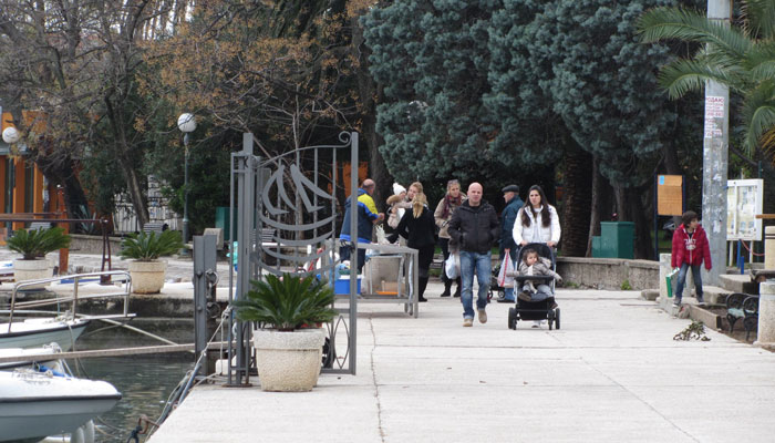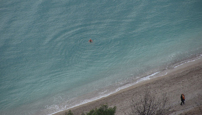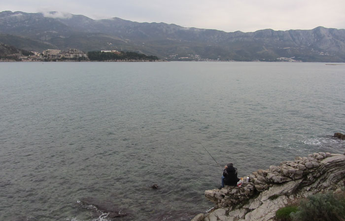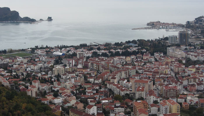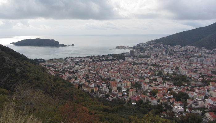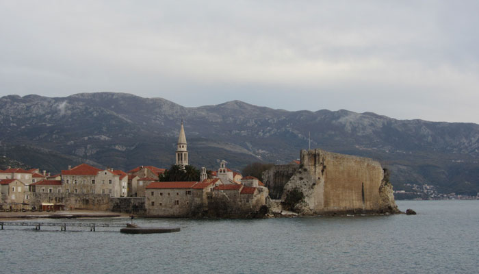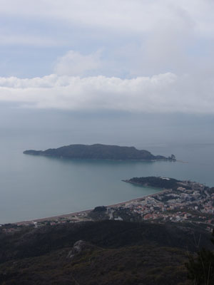 この海岸にある町が、目指すブドヴァだ。坂を一気に駆け下りて、町に到着。途中、海に入って泳いでいる人を発見。あの大雪ゾーンを自転車で走った同じ日に、海で泳ぐ人を見かけるとは、なんちゅうギャップ。季節感が狂わされ、なんだかクラクラしてくる・・・