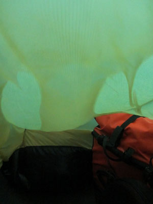 さて、10時過ぎ、カホンを叩くのを一旦やめ、ふと我にかえると、外がだいぶ明るくなっていた。雨音もしない。で、テントの外を覗いてみると、雲の合間から青空が見えた。強風のため、空の雲がすごい勢いで流れている。青空が覗いたかと思えば、次の瞬間に雨雲が広がり、ポツポツと雨が降り始めたりする、超気分屋天気模様。「うむむ・・・ビミョウだが、まぁ、走れないことはないか」ということで、楽器をかたづけ、荷物をまとめ、走る準備。