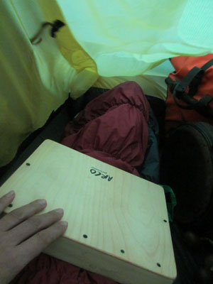 朝になっても、雨は止まず。暴風も収まらず。外に出られやしない。このまま雨風が止まないのなら、一日ここで過ごすことになってしまう・・・まぁ、それでもいいかと思えるところが、5年目に突入したチャリダーの余裕ってやつですかね。こんなこともあろうかと、一日停滞するくらいなら、なんとかなる食料は持参しているし、水も多めに持っている。時間だって、楽器を弾きはじめちゃうと、意外とあっという間に過ぎてしまうもので、退屈もしやしない。今朝も、今日はもう、動けないもんだと割り切り、朝からカホンを叩いていたら、気付いたら10時過ぎになっていた。