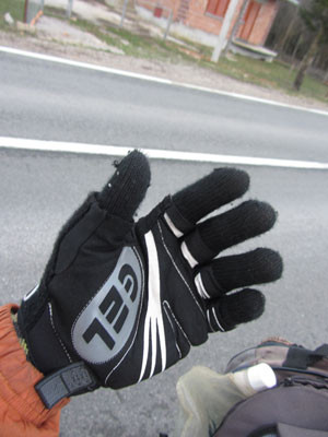 どうも、旅の女神様は、最近オイラに意地悪だ。実は、おととい走っていた道のどこかで、アラスカで買って、ずっとお供してもらっていた防寒手袋を、落としてしまったのだ。最近朝寒いため、出発時はあの防寒手袋をして走り始めていたのだが、走っていると暑くなってくるため、サイクリンググローブに取り替え、夕刻になるとまた寒くなるから再度、防寒手袋に取り替える、なんてことをやっていたんです。で、いちいち手袋をしまいこむのがめんどくさくなって、前カバンにマジックテープで留めるだけなんて状態で走っていたのがいけなかったのか、気付いたら、なくなっていたんですよ。え?それって、手袋をしまうのをめんどくさがったのが悪いんジャン・・・ええ、実は、全然女神様の悪戯なんかじゃなく、完全にオイラのミスなんです、ハイ。