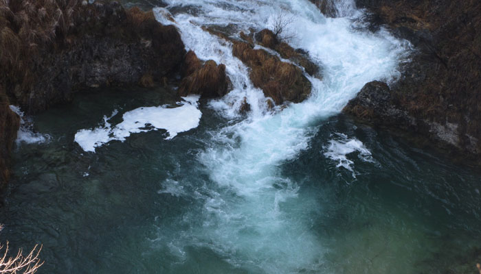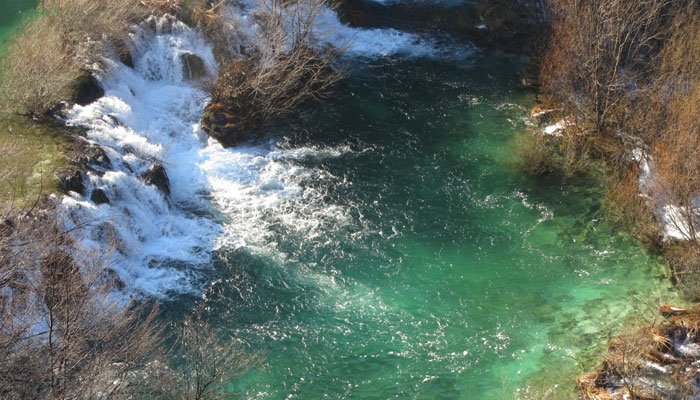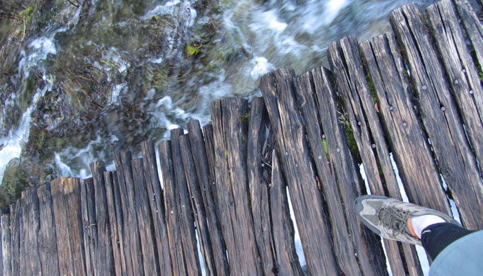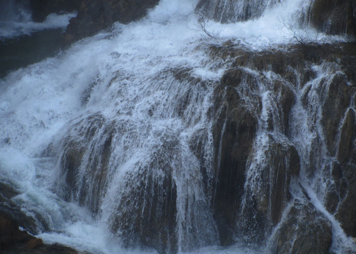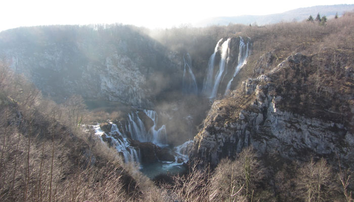 40クーナ支払ってチケットを購入。早速中へ入る。まず見えてきたのは、複雑な隆起の岩岩の間を流れ落ちる滝。ふむふむ、なかなか美しいじゃないか、しかし、これくらいで世界一はないだろう、と若干穿った想いで、滝を眺める。で、ここから先の道が、滝の下のほうに降りられるようになっていたので、降りてみることに。下まで降りると、湖の上に遊歩道が引いてあり、滝の下まで歩いていけるようになっていた。が、この時期、水で濡れる木の遊歩道は、凍ってしまうようで、滝の近くは、つるっつるになっていて、怖くて、とても歩けない。他の人たちも、トライしようとしていたが、結局みんな、諦めて引き返してくる。