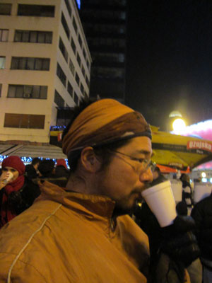 で、屋台では、いろいろなモノが売っていたのだが・・・一応夕飯は宿でガッツリ自炊して食ってきたため、そんなに腹は減っていない。そんなオイラの目に飛び込んできたのが、なにやら皆さんが飲んでいる暖かそうな飲み物。ん?これは・・・ひょっとしてグルーワイン(ホットワイン)なのではないか?と、売り場のおじさんに聞いてみたら、やっぱり、グルーワインとのこと。おお、ドイツのクリスチャン宅で飲ませてもらったグルーワイン。そうそう、グルーワインって、クリスマスとか年末とか、この時期に、屋外で振舞われて飲むものだったらしいのですよ。ということで、ここで、本来のグルーワインの楽しみ方を堪能することに。