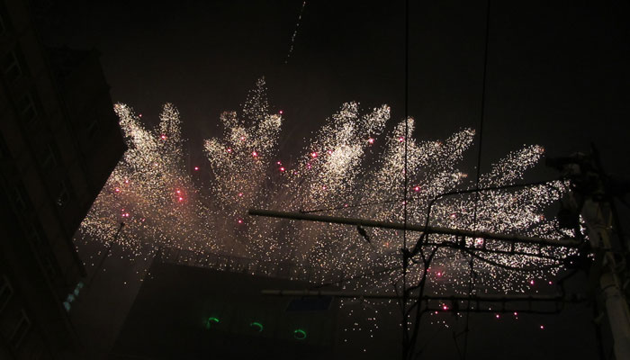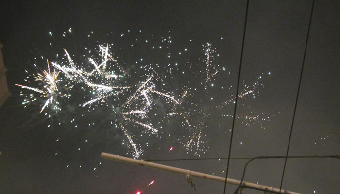 さて、グルーワインを飲みながら、体を温め、再びライブ鑑賞。そして・・・23時半が過ぎ、いよいよ今年もあと少しとなってきた。フライング気味で、空には打ち上げ花火があがりはじめ、観客も、手持ちの発火筒に火をつけて、テンション上がりはじめた。