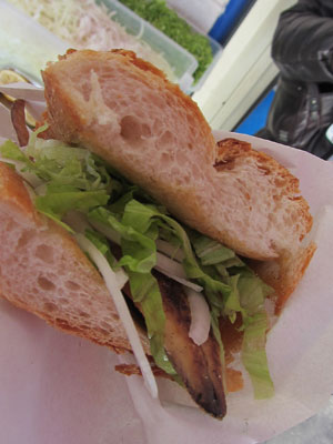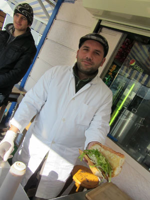 さて、ガラタ橋近くにあるという病院へ行くついでにイスタンブール観光。ガラタ橋付近が、いい雰囲気で。写真好きなオイラとサカタさんは、二人で写真を撮りまくり。そして、食べ物好きでもあるオイラとサカタさんは、途中途中で屋台飯などをつまみまくり。ヒヨコマメご飯に鳥肉をちぎって乗せたやつについてきた付け合せをラッキョだと思って食べたら実は激辛唐辛子だったり、いろいろつまみ食いしてお腹いっぱいになり「もう、飯は十分だね」なんて言ってたのに、名物サバサンドの店を目の前にしたら、食べたくなって、結局オーダーして食べちゃったり。