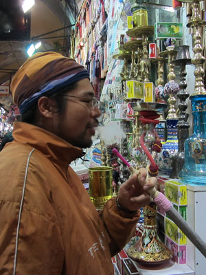 そんな「オチマシタヨ」攻撃炸裂のグランバザールを歩いていたら、「オチマシタヨ・・・ミズタバコイカガ?」という、水タバコ屋に出くわした。水タバコには興味があったオイラ、ココは無視して通り過ぎることが出来ず・・・水タバコを体験させてもらうことに。手渡されたパイプを吸う。煙が体内に入っていっているようなのだが、あまりその感覚はない。煙の甘い香りは、十分吸い込んだ後、吐き出す時に、感じれるのだ。今回お試しさせてもらった水タバコは、ストロベリー味。ちょっとアルコールが入っているとのことで、言われてみたら、吸った後、ちょっとお酒を飲んだ後のようなクラッとする高揚感がある気がする。ふむふむ、これが水タバコか。なかなか面白い体験だったので、禁煙した身だから煙を吸うのはちょっと・・・というサカタさんに「いや、タバコとは違いますから」と勧めるオイラ。勧めに乗って、水タバコ体験するサカタさん。テンションあがったんで、調子に乗って勧めちゃったんだけど・・・うむむ、これをキッカケに、サカタさんが、またタバコを吸い始めちゃったら、オイラのせいってことになるな。ふおお、そうなったら、すいません、サカタさんの彼女さん・・・