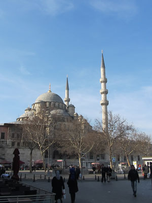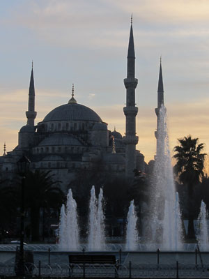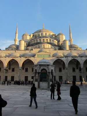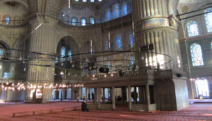 さてさて、グランバザールを抜けた後、無料でいけるイスタンブールの名物観光スポット、ブルーモスク(スルタンアフメット・ジャメイ)へ。靴を脱いで中へ入ると、雰囲気ある空間が広がっていた。しかし、思ったより青くない・・・ブルーモスクというくらいなので、内部は青色空間なんだろうと思っていたのだが、そうでもなかった。このブルーモスク、内部に使われているイズニック・タイルというのが青色で、それにステンドグラスを通した青い光があたって、美しい青色を奏でるとのことらしいのだが・・・そこまでの青色は感じれず。うむむ、夕刻に行ったから光が弱かったんだろうか、ちと残念。