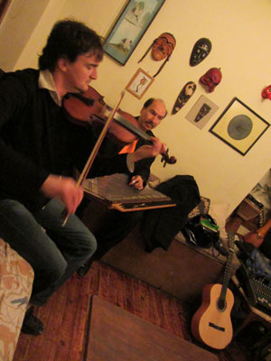 さてさて、音楽好きなトルコ人のパーティに、音楽は欠かせないという。そして、ここは、ミュージシャンのナイル師匠のホームパーティですから・・・当然、流れる音楽は、生演奏。いつもダラブッカレッスンをやっている居間スペースは、音楽ステージになっていて、男の人が、バイオリンのチューニングをしていた。さらに、後からやってきたもう一人のおじさんが、台形の箱に多数の弦が張り巡らされている<カーヌーン>という、日本の琴のような楽器を持って登場。二人そろったところで、合奏をしはじめた。