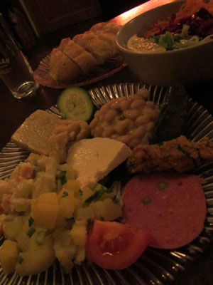 さて、話が一段落したところで、一人のおばさんが、立ち上がり、ステージ前に置いてあったダラブッカを持ちだし、バイオリンとカーヌーンの合奏にあわせて、叩き始めた。おお、トルコ人は、女の人でも、ダラブッカが上手い・・・そして、おばさんが飛び入り演奏をはじめたのをキッカケにして、食事中の皆さん、楽器の演奏に合わせて、歌い始めまして。多分、演奏されていたのは、トルコの有名な民謡なんでしょうな。みんな歌詞を知っているみたいで、みなさんで大合唱。