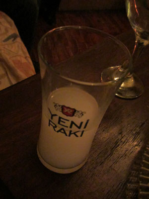 こんな感じの素敵な雰囲気の中で、美味しいトルコ料理もたらふくいただきまして。さらに・・・イスラムの国なのに、なぜか<ラク>という国民酒があるトルコ。ブドウのエキスとアニスの実から作った蒸留酒である、そのラクも飲ませてもらいまして。味は・・・まぁ、そんなに好みの味ではなかったですが、このラクってお酒、ちょっと面白い仕掛けあり、興味深かった。もともとは透明なのですが、水で割った瞬間に白濁するという面白いお酒なんですよ、コレ。。