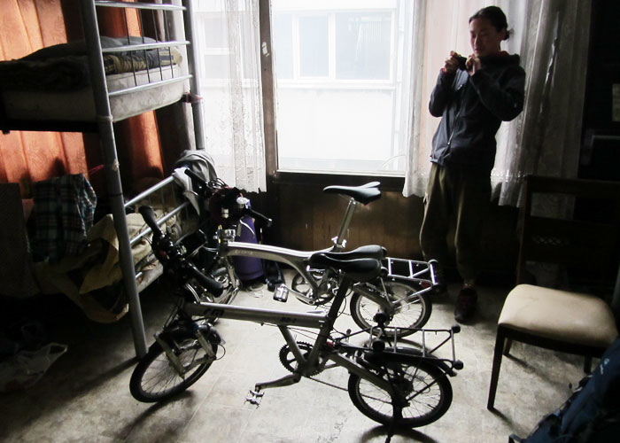 さて、BD-1を使って世界を旅する同士のガクさんとオイラですが、実は、お互い旅のスタイルは全然違う。オイラは、折りたたみである利点はあまり使わず、ひたすら走りメインで乗っている<なるべく全道程チャリ走りスタイル>なのですが、ガクさんは、折りたたみである利点を十分に生かして、町から町への移動は公共交通機関を使い、町に辿り着いてから、BD-1を広げて、走り始めるという<町乗りスタイル>。