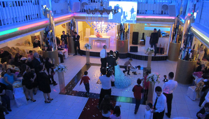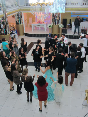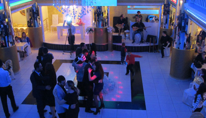 バンタクシーに乗って、イスタンブールの郊外へ。辿り着いたのが、かなり豪華なパーティ会場。オイラたちは、二階に通された。結婚パーティーの様子を上から眺められる席だ。