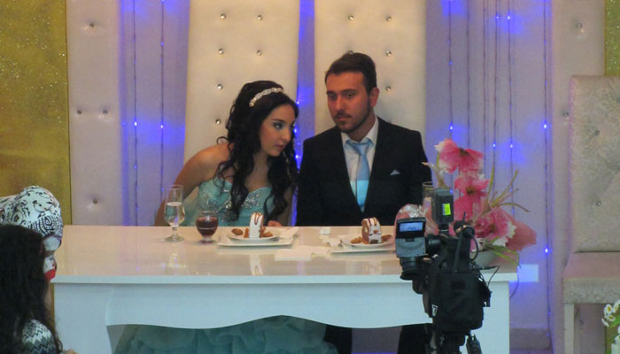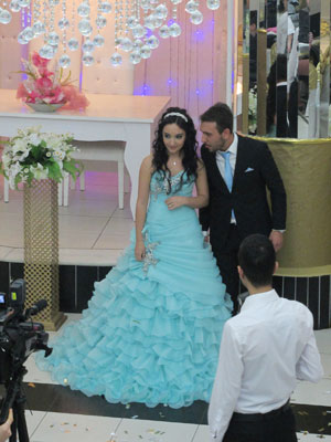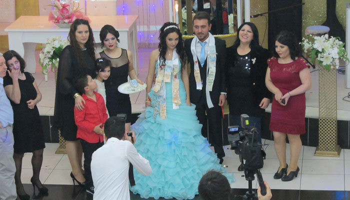 その後、参列した来賓の方々と新郎新婦さんの写真撮影タイムとなった。写真撮影がひとしきり終わった後、ケーキが運ばれてきて、ケーキカット。で、ここからがちょっと興味深かった。長めの白い布を首に巻いてもらった二人に、参列者が次々と、その白い布に、お金をつけていったのだ。これが、トルコ流のご祝儀のあげかたなんでしょうな。