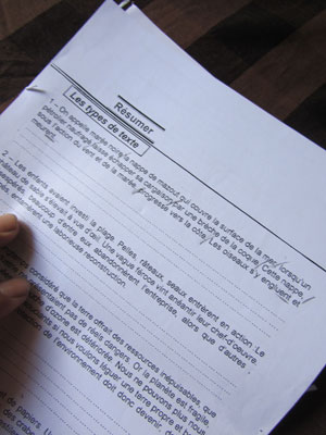今日も、まずは発音練習から。昨日発音練習した文章の復習から始まり、今日は二番目のセンテンスへ突入。そうそう、フランス語って鼻に抜ける鼻母音が特徴的じゃないですか。ネイティブのフランス人が話すフランス語とか、テレビから聞こえてくるフランス語は、この鼻母音がバリバリに効いているんですけど・・・アフリカ人のフランス語ってあんまり鼻母音が効いてないんですよ(いや、効かせている人もいるにはいるのだが)。ピートゥ先生も、あまり鼻母音を効かせてない。なので、オイラが鼻母音を適当に発音していても、あまり注意されない。うむむ、この鼻母音を効かせてこそ、フランス語だという意識もあるのだが・・・