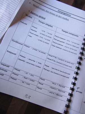 フランス語の文法は、スペイン語の文法に似ているので、一応スペイン語をかじったオイラとしては、戸惑うことなく、文を理解することが出来ていたんですが・・・過去表現や未来表現、そして、動詞の前に出てくる代名詞表現など、フランス語独特の表現にはちと戸惑いまして。とりあえず、丸暗記してきたんだけど、時間が余ったので、せっかくだから頭を整理しておこうと、過去形・未来形の仕組み、代名詞の使い方等々、文法を集中的に教えてもらった。