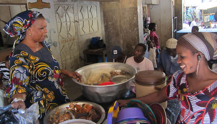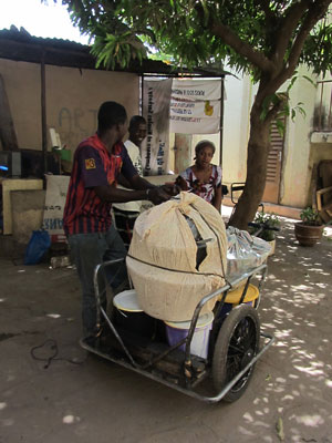 出店場所に到着して、鍋を広げ、さっそく盛り付け始めた姉さんたち。アワ姉さんのパートナーであるロキア姉さんについて、マルシェで働いている人たちへの出前のお手伝いをすることに。ふむふむ、出店を出してそこに客に来てもらうだけではなく、働いてて店から出られないマルシェの人たちのために出張サービスまでやっちゃっているんですな。ということで、オーダーを聞いてきた後、皿に盛り付ける。ここまで、オイラはただ金魚のふんのようにくっついているだけ。で、運ぶ段階になったら、手伝えるだろう、って思っていたのだが・・・盛り付けたお皿は全部、ロキア姉さんが頭の上のお盆に乗せて上手に運んでしまったので・・・やっぱりオイラの出番はなし。うむむ、オイラは、ただ、ついていって、出前先のおじさんたちに愛想をふりまいているだけの役割でしかないのか。いや、しかも、バンバラ語でしか話してこないから、おじさんたちとの会話もままならないって・・・