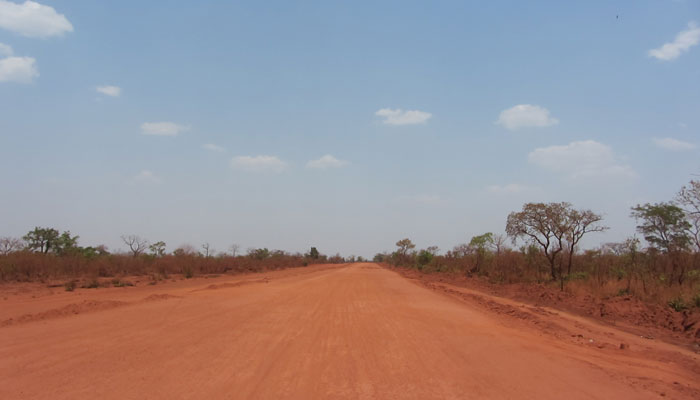 さてさて、走り始めたバマコ郊外からの道ですが・・・ミシュランの地図ではずっと赤く塗ってある<舗装>幹線道路を走っているはずだったのだが・・・どうやら、アスファルトを張りかえる舗装工事をやっているらしく、迂回道を走らなければならなくなり、この迂回道が・・・未舗装道路だった。で、この舗装工事がひたすら続いていて、延々、未舗装道を走っていかねばならないハメに。