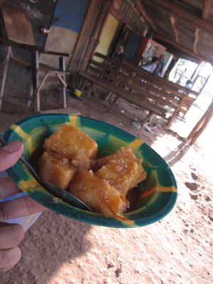 <その辺>と言っても、日があるうちは、村の人が行き来しているんで、テントを張っても邪魔になっちゃうだろうと思い、とりあえず、日が暮れるまで、ガソリンスタンドのベンチで休ませてもらうことにしたオイラ。休みがてら、村を行き来する人たちのことをボーっと眺めていたんですが・・・そこで、食べ物売りの女の子に、おもわず目が釘付けになってしまいまして。ラグーというジャガイモを煮たものを売っていたこの女の子、びっくりするくらい美人さんだった。思わず写真を撮らせてもらっちゃったんですが・・・う~ん、オイラの写真テクじゃ、1/10くらいしか美人具合を撮りきれなかった。実物は、そりゃもう、美人オーラでまくりでしたよ、ハイ。