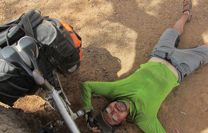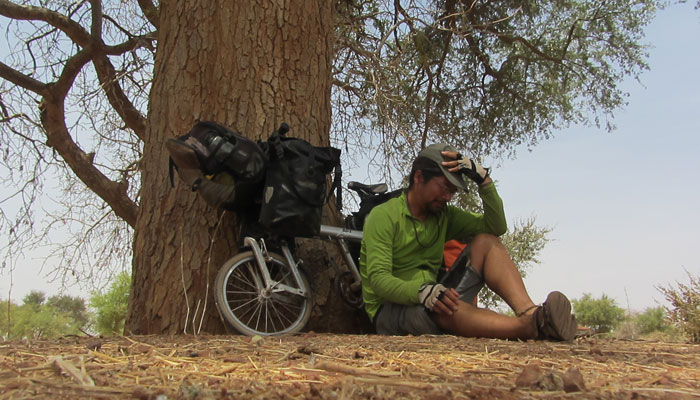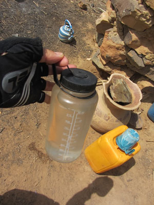 さて、この暑さなんで、とにかく水の消費量が半端なくなる、ってのは分かっていた。だから、いつも以上に水を補給して走っていたのに・・・まさか、途中で水がなくなってしまうとは。そんなまさかの事態が起こってしまったのだが・・・この道沿いには、結構な頻度で小さな村が点在している。そして、村には、村の飲料水が、水瓶に入れて置いてある(たぶん、井戸水)。ということで、村に立ち寄って、水瓶に入れてある、村の飲料水をいただくオイラ。一応、近くの木陰で昼寝中のおじさんに断って水をもらいましたんで・・・水泥棒ってワケじゃないですから、ハイ。