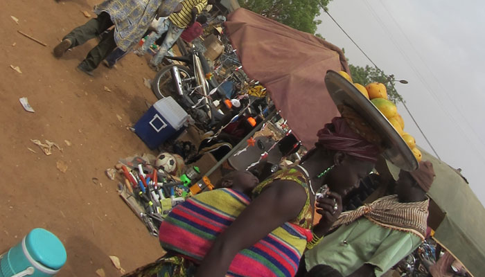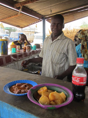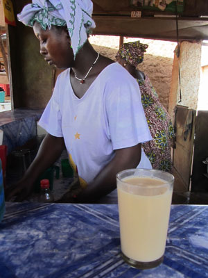 とりあえず、バンカスという町に到着。朝飯は、昨日の晩飯の山盛りマカロニを半分残したやつを食べたので、腹はそんなに空いてはいない。一休みがてら、コーヒーでも飲むか、とカフェスタンドに入って、コーヒーを頼んだのだが・・・この辺ではコーヒーとはカフェオレがディフォルトらしく、カフェオレが出てきてしまった。しまった、ミルク抜きってわざわざ言わなきゃいけなかったか・・・いや、オイラ、カフェオレは好きなんですよ。普通のミルクが入っているやつなら。が、マリのカフェオレって、超甘ったるいコンデンスミルクが入っているんです。このカフェオレ、飲むと、頭痛がしてくるくらいの激甘。いつもなら、甘党のオイラでも、これはちょっと・・・って思うくらいの甘さなのだ。が、疲労困憊状態の今、このカフェオレを飲んでみたら・・・意外とこの甘ったるい甘さが、体を癒してくれた。うむむ、これは、疲れ果てた状態で飲むとちょうどいい飲み物なのかも・・・って、マリの人は、常にこれをゴクゴク飲んでいるんですけど。そんなに、皆さん疲れているんですかねぇ?