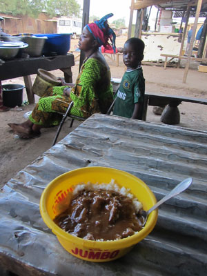 朝、メイン通り沿いにあるおばちゃん食堂で、洗面器に入ったぶっかけ飯を食べる。さて、ロンプラには、コロからブルキナファソに抜ける場合、コロでパスポートの出国手続きをしておけ、と書いてあったので、イミグレオフィスはどこでしょう?と、一緒に飯を食っていたおじさんに聞いてみたところ、どうやら、今は、コロの次の<キリ>という村にイミグレオフィスがあるらしい。