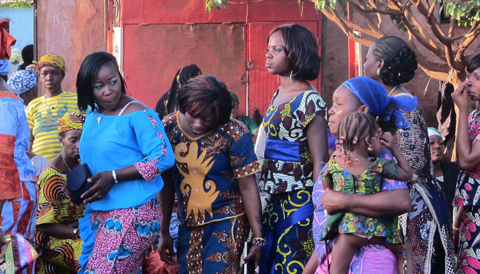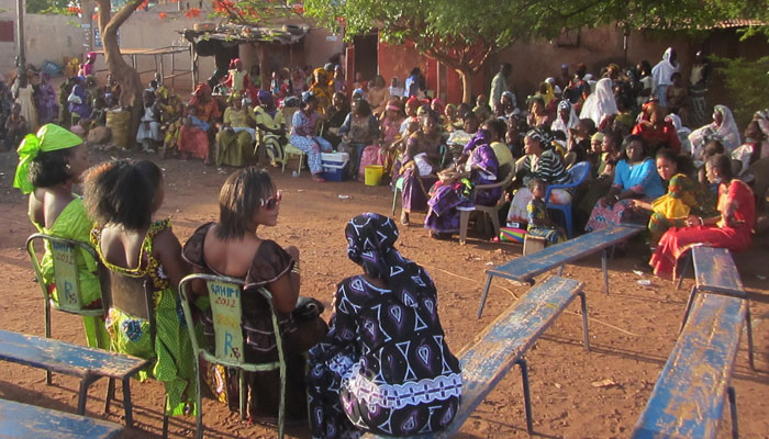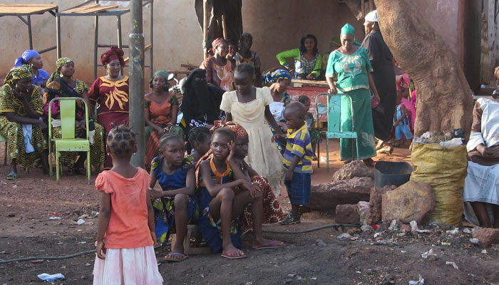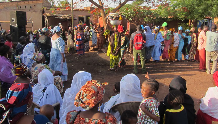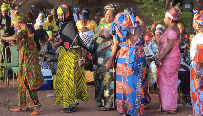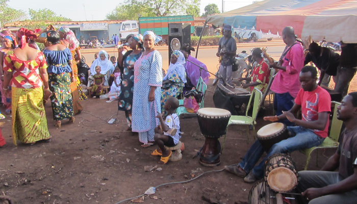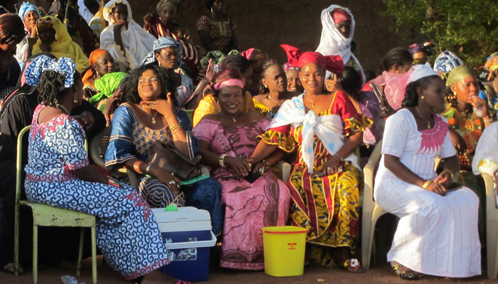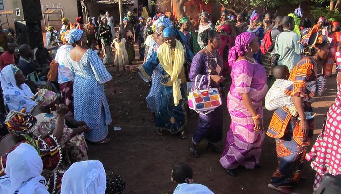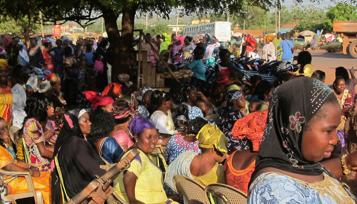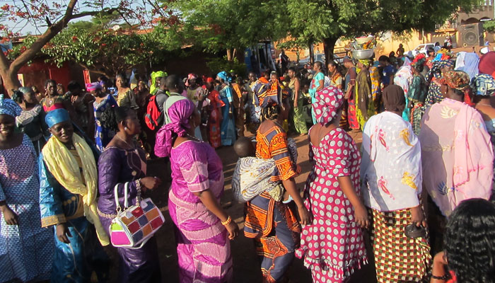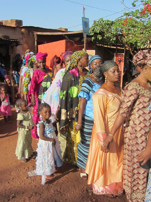 さて、今日は、レッスン後、トゥグマニ師匠が「ミスターヨシ、今日の夕方から、セレモニーがあって、そこでプレイするんだけど、見に来るかい?」と誘ってくれまして。もちろん、見に行きますよ、ということで、夕刻16時に、モスク前に行ってみたところ・・・キレイな服を着たブルキナ女性たちが大集合していた。