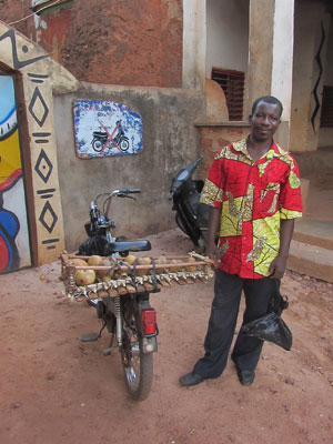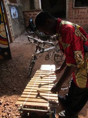 で、センターの入り口で待っていたら・・・トゥグマニ師匠が、バイクの後ろにバラフォンをくくりつけて登場。おお、これが、オイラのバラフォンっすか!