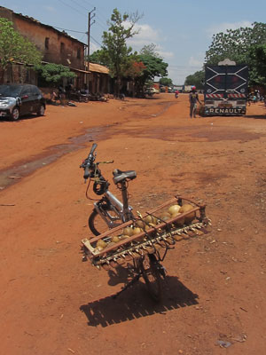 バラフォンレッスンが行われるセンターまで、毎朝チャリで通っているオイラ。今日からは、マイバラフォンを持参してレッスンに向かうことになる。ということで、チャリの後ろにバラフォンをくくりつけて運ぶことにしたのだが・・・明らかに横幅が広すぎる。むむむ、フル装備に、このマイバラフォンを付け加えることを考えたら、リアのサイドバック以上に横幅が膨れてしまうじゃないですか。3kgも重量が増えちゃうしなぁ・・・