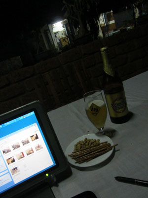 で、ここのレストランの飲み物や食事は高いので、何も頼まずに、作業だけやらせてもらっていたところに・・・オーナーが「バラフォン、がんばっているな。これ、奢りだ」といって、大瓶ビールを差し入れてくれた。ふおお、いいんですか、さっきメニューをみたら、このビール一本1800CFA(300円強)って書いてありましたよ。オイラの払う一日の宿代とほぼ同じなんですけど・・・