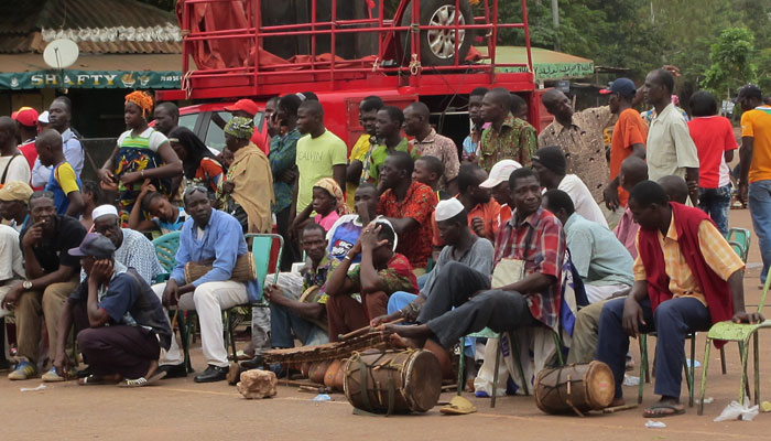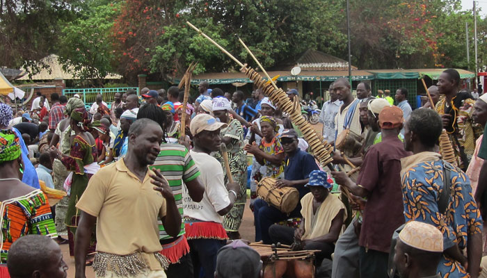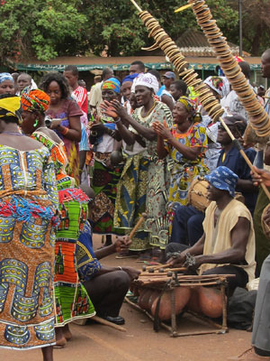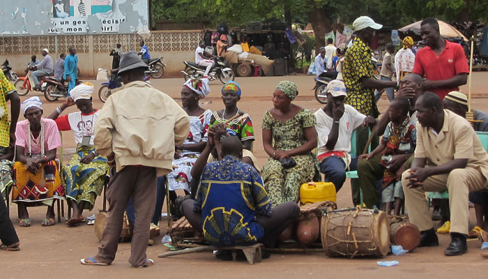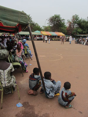 さて、そんなレッスンの帰り道、いつも通っている鉄道駅のところで、なにやら、人だかりが出来ていて、太鼓の音が聞こえてくる。おお、これは、なにかのお祝い事?と思って近づいてみると、どうやら、本日、ブルキナ各地から伝統音楽を奏でるミュージシャンを招いて、<ブルキナ伝統音楽イベント>なるものが、ここ、ボボの鉄道駅前広場で開催されているとのこと。