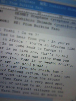 さて、レッスンを終え、いつものように、昼飯を食べに行くレストランで、ネットにつないでメールチェックをしていたら、フランスのボルドーでお世話になったステファンからメールが届いていた。オイラが西アフリカにいることを知って、<トーゴ>にぜひ行くようにとの、トーゴお勧め場所情報のメールだった。