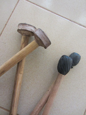 バラフォンを叩くバチ、打面と当たる部分が加工してあって、これ、松脂?みたいなもので固めてあるんです。で、トゥグマニ師匠からは、「このバチは、日光に弱いから日に当てないように」と注意されていたので、日に当てないように運んでいたんですけど・・・ボボからウンデまで走った日、灼熱の中走っていたら、直射日光に当てなくても、片方の打面の加工部が溶けてしまったようで、周囲の部分がすっぽり取れてしまっていたんです。
