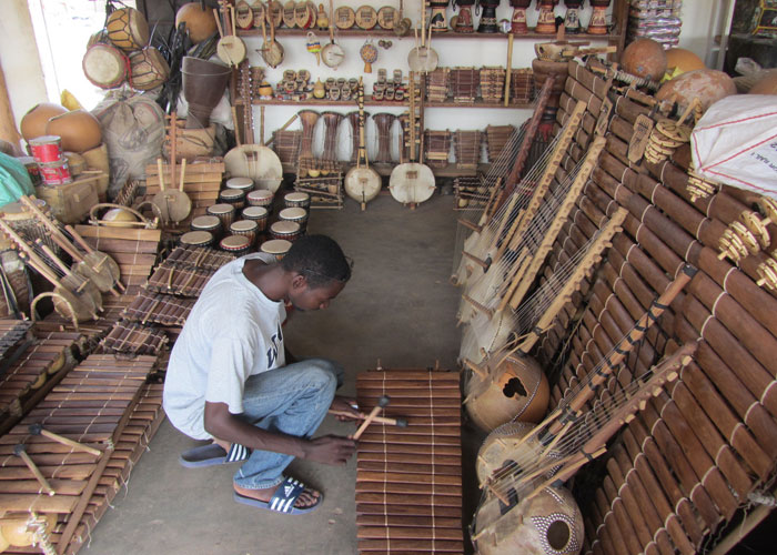 ということで、ワガドゥグで、このバチを直さねばと思ってまして。で、バラフォンが売ってそうなお土産屋さんへ行くことにしたんです。まず、宿の近くにあった土産物店街みたいなところに行ってみたのですが、バラフォンは置いてあるものの、いいバチはなかった。安物のバチならいくつも置いてあったのだが・・・しょうがないので、置いてあったジャンベで、店のお兄ちゃんと合奏するなどして、ちょいと遊ばせてもらった後、何も買わずに、店を出る。