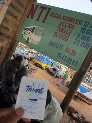 しょうがないので、小さなバス会社が寄り集まっているという<Gare Routiere>というターミナルへ行ってみることに。で、ここで、「ガーナ行きのバスを探しているんですけど」と訊きまくったら<NTI>という会社のバスのチケット売り場に案内された。お~、ちゃんとガーナ行きのバスあるじゃん。明日の朝8時半にここを出発する便があるらしい。とりあえず、オイラの次の目的地、タマレという町にも停まるみたいだし、よかった。タマレまで、8000CFAでバスチケットを購入。