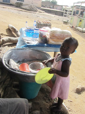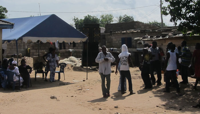 う~む、今日教わったことは非常にためになったぞ・・・と、レッスン後、村を歩きながら、習ったばかりのヘリ技の復習練習をしていたら、どこからともなく、太鼓の音が聴こえてきた。お、ガーナでは昼間っから太鼓を叩いているのかいな?と思って、音色のするほうへ行ってみたところ・・・広場みたいなところに、デッカイスピーカーが設置されていて、そこで、大音量で、太鼓音楽が鳴らされているだけだった。なんだぁ、生太鼓じゃないのか・・・と、ちと残念ではあったのだが、広場では、その音楽に合わせて、皆さん踊りまくっていて・・・この踊りが見れただけでも、まぁ、よかった。ガーナ人の踊りは、どことなくキュート。