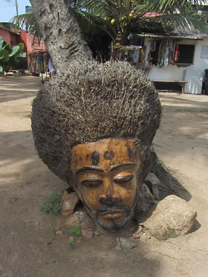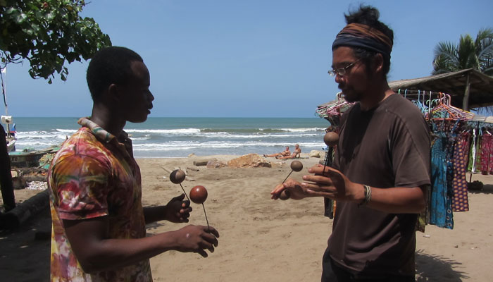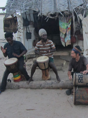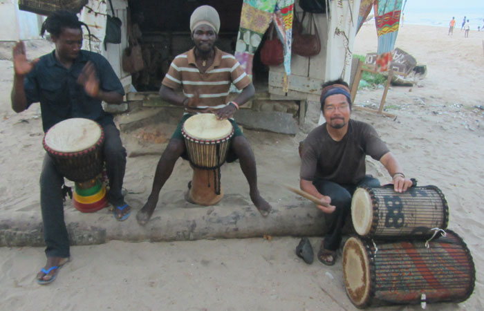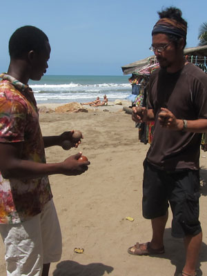 その後、海岸で、コシュカシュの練習をひたすらしていたら、夕刻にまたもや太鼓の音が聴こえてきた。時々不安定に途切れる感じは、今度こそ、生演奏っぽい。ということで、行ってみたら・・・二人のラスタマンが、ジャンベを叩いてた。お~、なるほど、これがガーナ・ジャンベかぁ、と思って、聴かせてもらっていたところ、演奏がひと段落したところで、「サンバ&ケニケニを叩いてくれないか?」とのお誘い。よろこんで、と、二人に交じって、太鼓演奏をすることに。一応ね、ジャンベと合わせて叩く、サンバ&ケニケニも、ジプソンや、ジャー師匠に教わっていたので、それなりには叩けるオイラ。叩き終わった頃には、すっかり周囲は暗くなっていた。