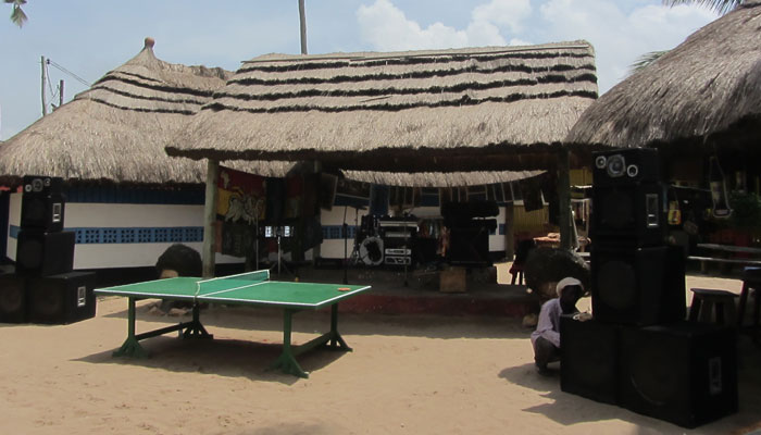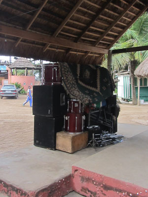 朝起きたら、昨日の太鼓たちはきれいに片付けられ、ステージには、スピーカーやPAやドラムセットやらが、山積みされていた。今日の夜のステージは、ガーナのモダンミュージックらしい。音楽大国であるガーナ、興味があったのはトラディショナル音楽だけじゃなかったんでね。今流行っている音楽を体験するってのも、ガーナでやりたかったことの一つ。うむむ、今夜も楽しみだ。