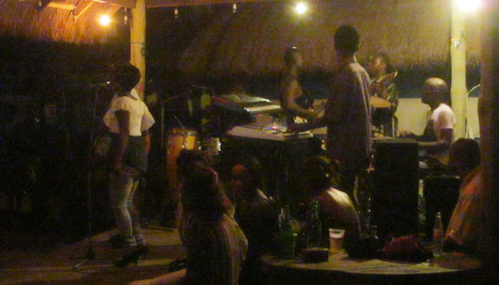 さてさて、今日の夜のステージはというと・・・まず、前座として、オイラが浜辺でジャンベセッションをさせてもらっているマドゥたちがやっているバンドの演奏が始まった。楽器としてはコラとかも入って、ブルキナ風。ま、これは、マドゥたちが、ブルキナ出身って聞いてたから、そう感じれただけなんだけどね。きっと知らなかったら「うむむ、ガーナもブルキナっぽい音楽なんだな」って勘違いしちゃっていたに違いない。