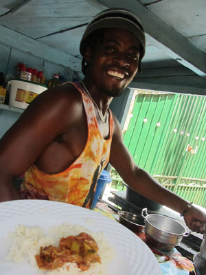 さて、今まで飯は、歩いて5分くらいいったところに広がるココロビテの中心まで行って、適当なお店で食べていたんですけど・・・昨日の夕刻から、宿近くにある<ライスマスター>という屋台が開きまして。ライスマスターのマスターであるジョーさんによると、客が増える週末だけ、料理を作って出しているとのこと。で、昨日の晩、この<ライスマスター>が開いているのを発見し、近いからという理由で入ってみたのですが・・・ここの唐揚げが絶品だったのですよ。サクサクの衣に、ほんのりスパイスのカホリがするジューシーな鶏肉本体。ここの唐揚げは、旅で食べた唐揚げで、ナンバーワンの味。ジョーさん、日本で店を出しても、絶対売れるよ、これ。