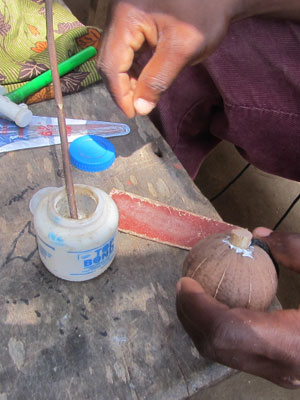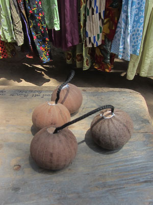 そんなサム師匠、今日は、売り物用に新たなコシュカシュを作るっていうんで、レッスン後、コシュカシュ作りを密着取材させてもらうことに。ガーナでのコシュカシュの実は、Volta Regionというホーという町の近くの場所で採れるらしい。で、そこで採ってきた実を乾燥させ、底部に穴をあける。中には種が入っていて、それだけでも、シャカシャカなるのだが、より鳴りをよくさせるために、細かい石ころを追加で入れるらしい。で、その後、この穴にヒモを入れ、穴よりちょっと大きめに作っておいた木の蓋状のモノで栓をする。この際、ボンドできっちり接着しておく。栓の飛び出した部分は、木槌で叩いて引っ込め、ヤスリで滑らかにして完成。