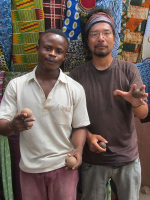 さて、3日ぶりに顔をだしてくれたサムに今日もレッスンのお願い。基本的な技とか、それらの組み合わせ方とかはだいぶ分かってきたので、今日はトリッキーな技として、片手プレイを教えてもらうことに。そうそう、ガーナ人は、よく片手でプレイしているんですよ。両手で出来ないから片手でしかやらないっていう人もいるのかもしれないけど・・・基本的に、片手プレイは片手プレイならではの、独特のノリを出すために、あえて片手でプレイしているみたい。